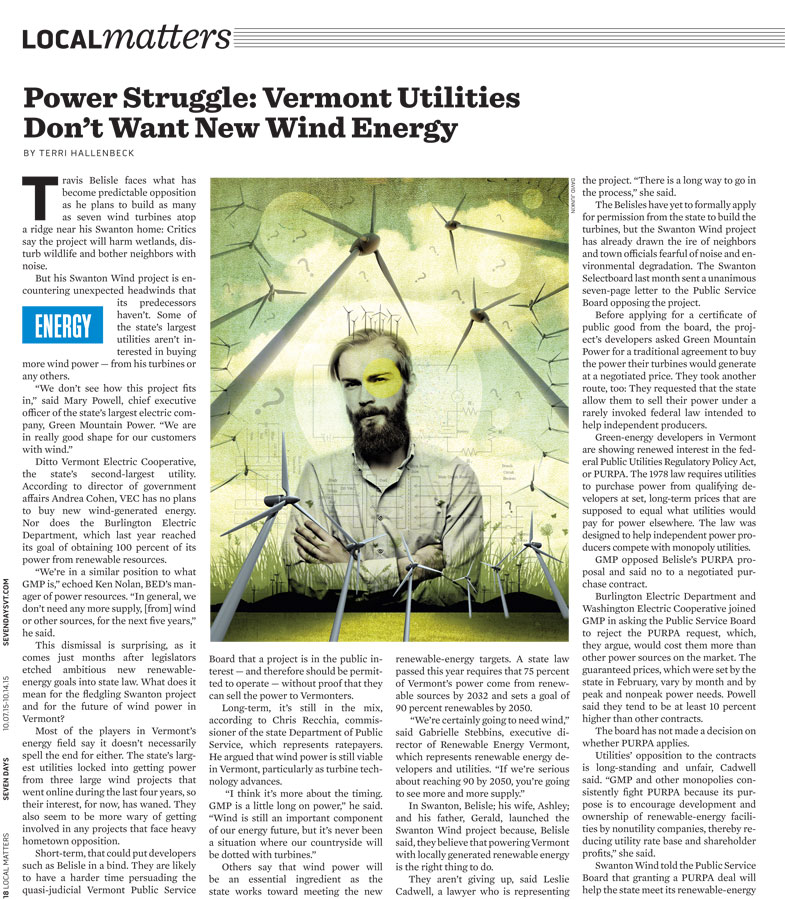 Here’s a great new piece by DAVID JUNKIN for Seven Days. The article for Local Matters is called “Power Struggle: Vermont Utilities Don’t Want New Wind Energy.”
