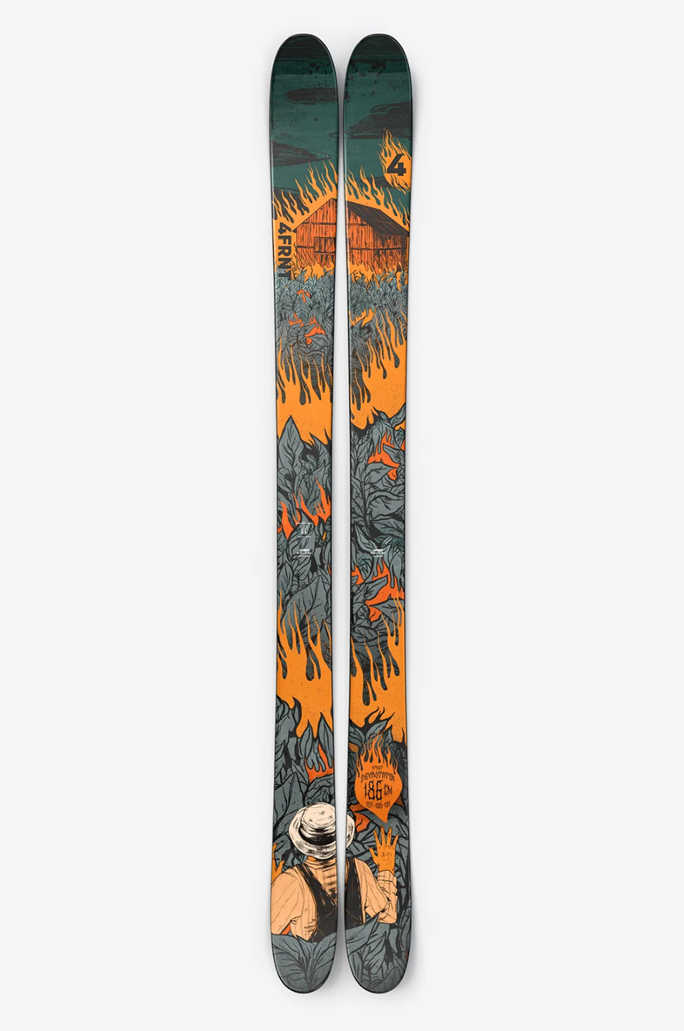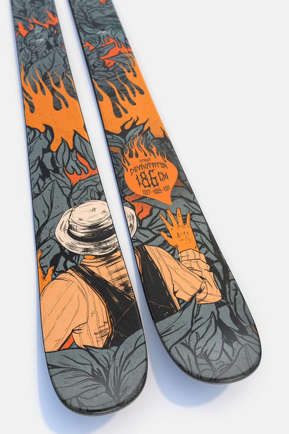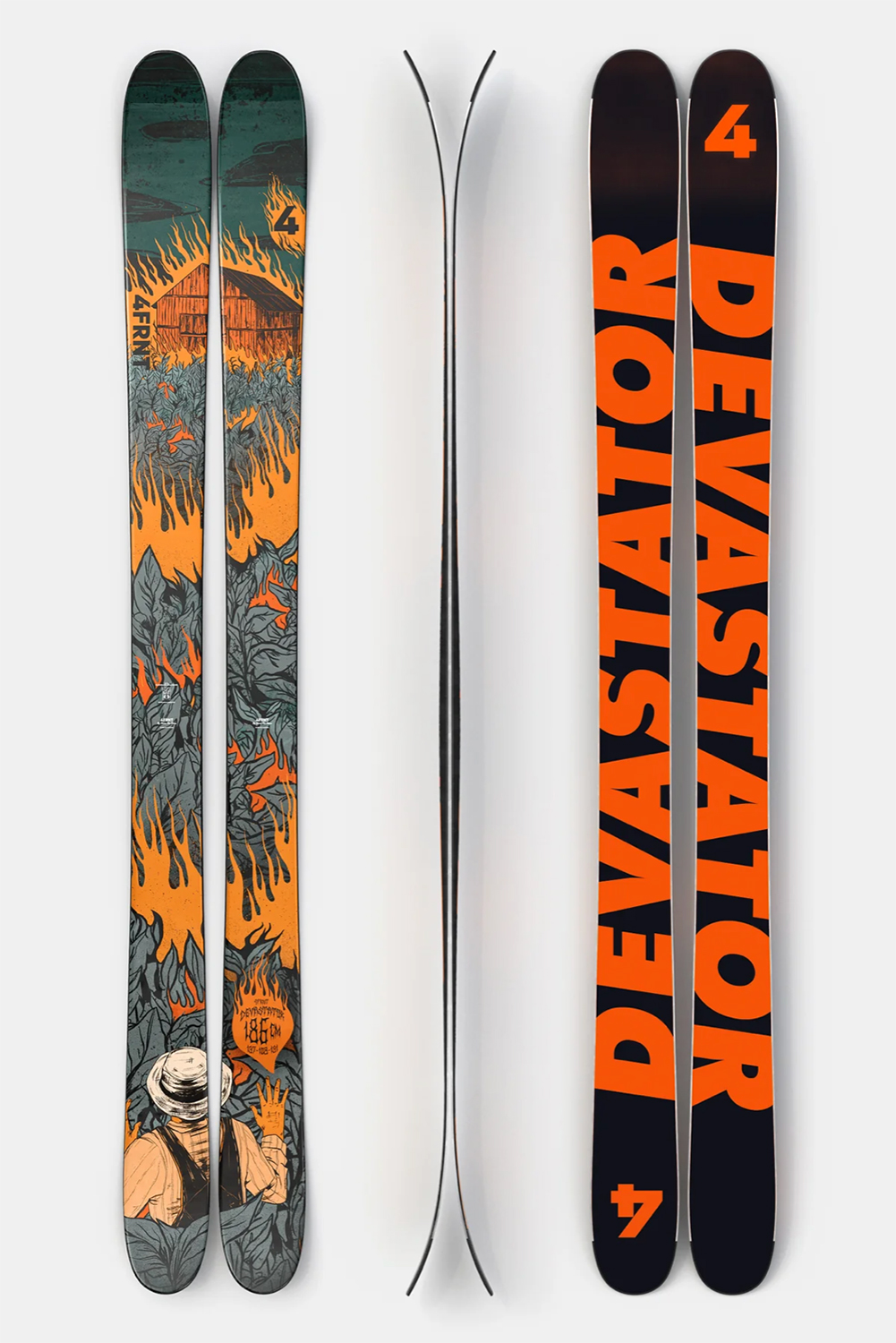 “The name says it all. The Devastator has earned its place as a 4FRNT icon for its ability to destroy any terrain in sight. Its signature multi-radius rocker profile lets you surf powder with ease, pivot through tight terrain, and slash with precision. This modern freeride design enables the sidecut geometry to work in unison with the pre-bent rocker shape, giving you feeling of camber in firmer conditions. With explosive pop, a light swing weight, and unwavering stability, the Devastator is a true freeride weapon—built to dominate in every condition, on every run.”