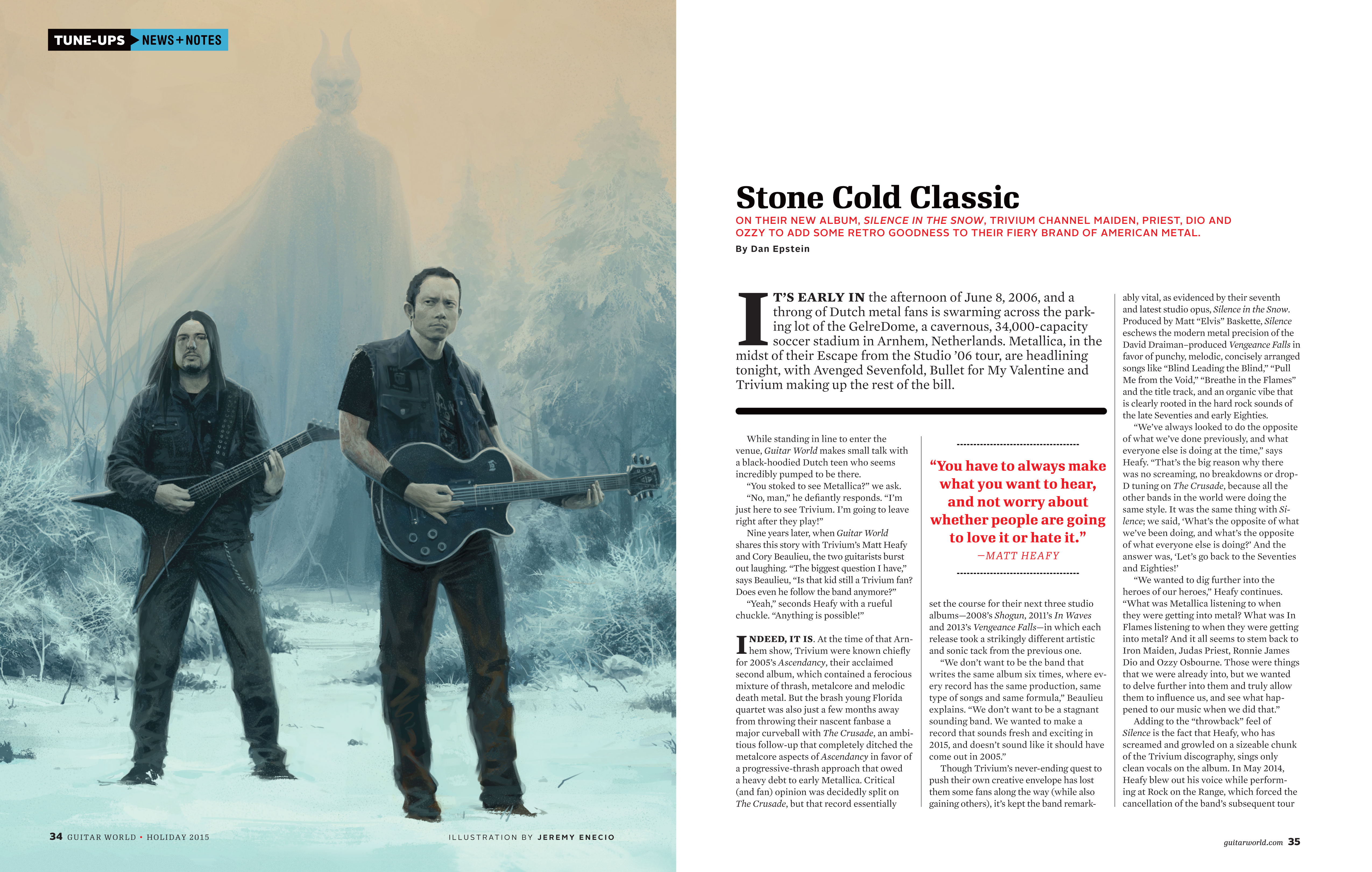 I’ve been dying to share this piece by JEREMY ENECIO originally commissioned by Guitar World. It’s a portrait of Trivium from their new album Silence In The Snow. It’s beautiful yet a bit eerie at the same time.