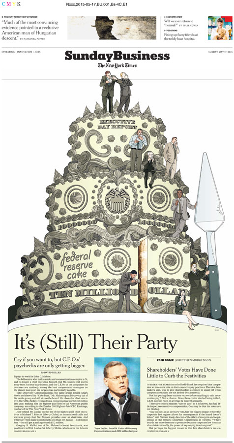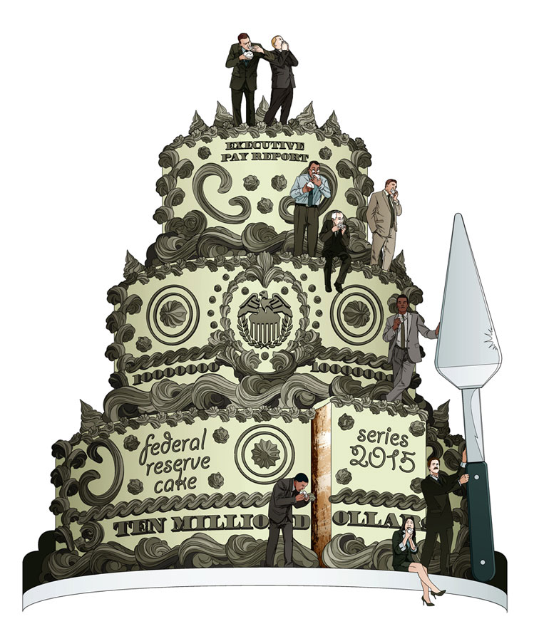 Have your cake and eat it too by KAKO for The New York Times! This fun illustration was commissioned for the article “For the Highest-Paid C.E.O.s, the Party Goes On” which in essence is the yearly executive pay report which showcases the millions upon millions of dollars these CEO’s are making. Kako was super excited for his first cover for the New York Times’ Sunday Business Review and getting the chance to work with the wonderful Mihn Uong! And to boot, it’s all about yummy cakes, just the way we like it! For those that don’t know Kako, his other half Carla Ikeda is a very famous Brazilian cake decorator so it makes the assignment even more fitting (check out her Flickr page, AMAZING!!!!)