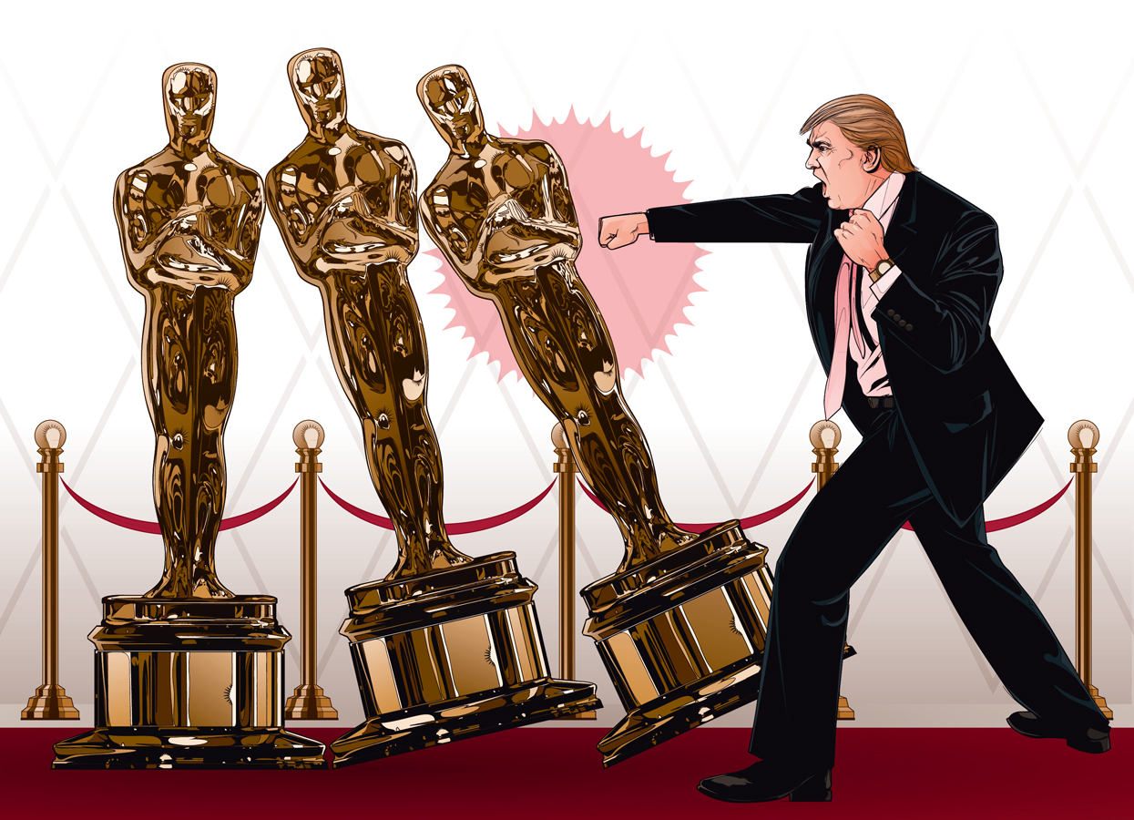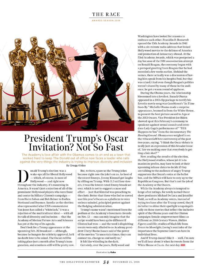 POW!!! Here’s a great one by KAKO for The Hollywood Reporter for their Awards Season 2016 section. The headline reads: “President Trump’s Oscar Inviation? Not So Fast…The Academy’s love affair with the Obamas comes to an end as a town that worked hard to keep The Donald out of office now faces a leader who rails against the very things the industry is trying to improve: diversity and inclusion…”