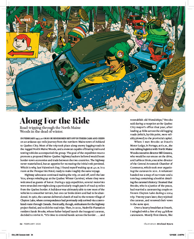 Hop on as we’re going “Along For the Ride” with #lcmartist Michael Byers and Down East Magazine. This illo was for a story about the caravan of cars that drive up to Quebec every year for the winter carnival — “Road-tripping through the North Main Woods in the dead of winter.” Sounds like a good time for sure!