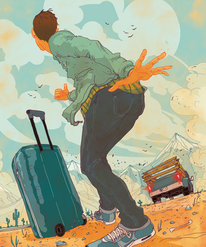 Here’s a fun read that so many of us can relate to. The illo by MICHAEL BYERS is called “Going Broke.” It was a piece for Mike’s monthly Travel Essay column in United Hemispheres Magazine. “Finding yourself far from home with no money can be a discomfiting, frightening experience, but it has its upsides.”