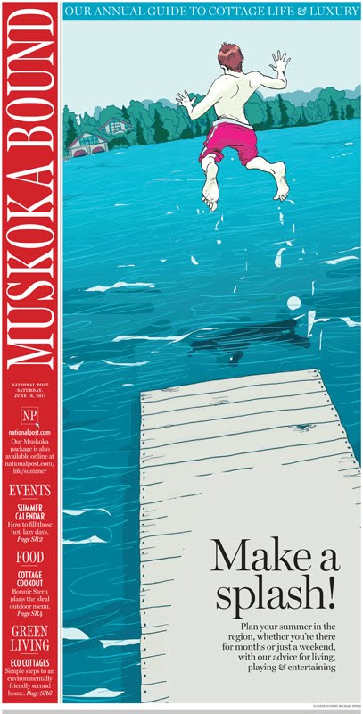 Levy Creative artist MICHAEL BYERS makes splash with a new great piece for the National Post in Canada. It was the cover for a section on cottage country called Muskoka Bound. Mike says “If the weather is anything like it is here in Guelph then I’m sure you all would love to be able to do this today instead of working in a studio.” He knows that is what he’d be doing.