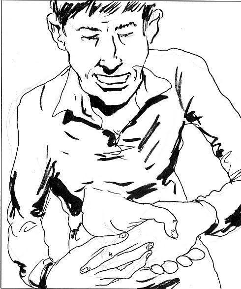 This piece was done for the back page of the magazine. It was a piece by Michael Keany about his making a truce with his body after having his gallbladder removed. The truce came after many years of abuse to his body from falling out of a tree as a youngster, to going ass-over-teakettle on a bike going down hill, to the many crashes with his dirt bike in his teens. The accidents took their toll and the final resort was to remove the little organ called the gallbladder. A lot of people get this removed, it’s actually quite normal. Here is the final piece Mike did for this article along with a few of his sketches.