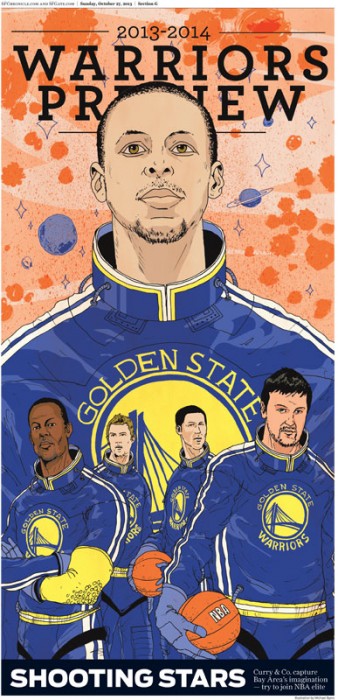 MICHAEL BYERS illustrates a great cover for San Francisco Chronicle for the 2013-2014 Warrior Preview called “Shooting Stars.” Thank you Luis Rendon for an awesome assignment and allowing Mike to do a fun basketball piece. Mike was able to put a slightly futuristic spin on the members of the Golden State Warriors basketball players. Instead of warm-up suits he gave them space suites showing the potential future of the team.