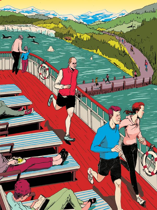 This piece was a story by sports writer Steve Friedman and his trip to Alaska. He signed up for the Great Alaskan Marathon Cruise. This would entail boarding a cruise ship that would sail around Alaska. Steve was one of several other running enthusiasts who would do daily runs. The Marathon cruise also included three stops at three different port towns in Alaska where marathon participants like Steve would do a small mini marathon at each location.