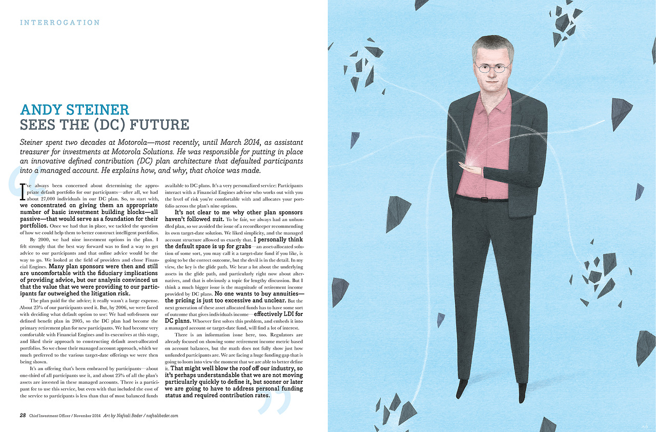 Another beautiful piece by NAFTALI BEDER for Chief Investment Office (aiCIO) Interrogation section. This article is called “Andy Steiner: Sees The (DC) Future.” Andy Steiner, “the 20-year Motorola veteran talks how and why it put in place an innovative defined contribution (DC) plan architecture that defaulted participants into a managed account.”