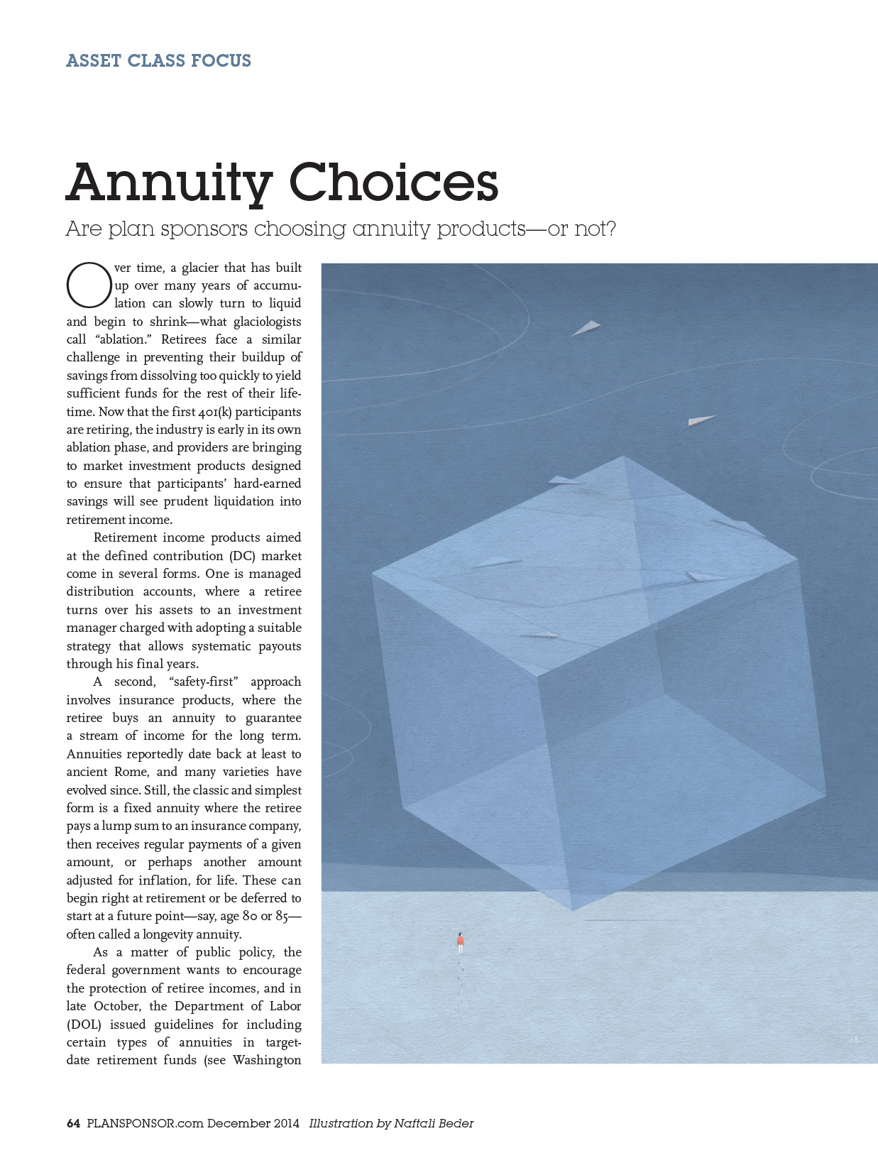 This was an interesting article illustrated by NAFTALI BEDER called “Annuity Choices” for PLANSPONSOR Magazine. “Are plan sponsors choosing annuity products – or not?” Naftali calls this piece “Glacier.” Definitely a nice addition to his portfolio of images for the magazine. Thank you again to SooJin for continuing to give Naftali great assignments that further add to his growing body of work with the magazine.
