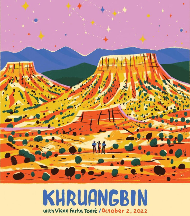 We're so happy to be sharing this amazing new poster art by #lcmartist Ryan Johnson for Khruangbin with Vieux Farka…