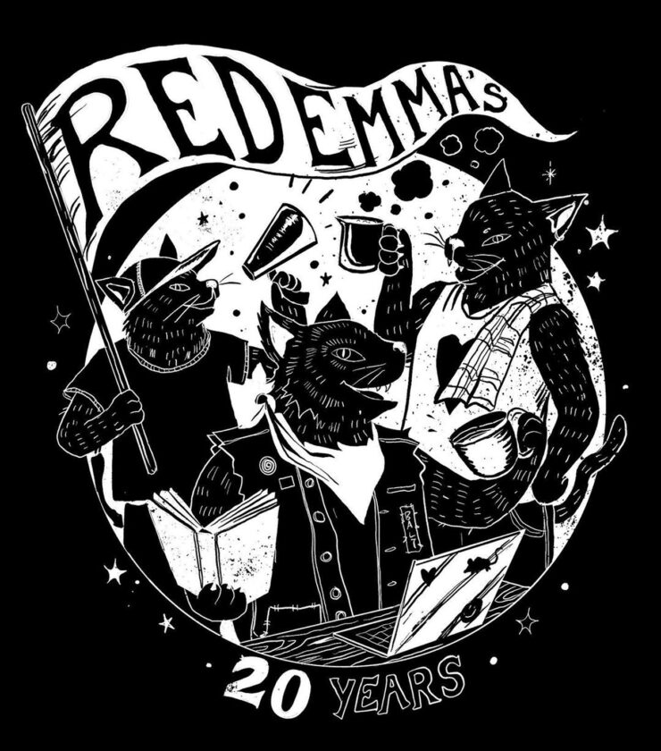 Celebrate two decades of community, liberation and feline rebellion with Red Emma's 20th Anniversary fundraiser T-shirt illustrated by #lcmartist Evangeline…