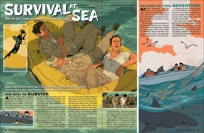 Here's a wonderful story called "Survival At Sea" beautifully illustrated by Michael Byers for Boy's Life. It takes four stories…