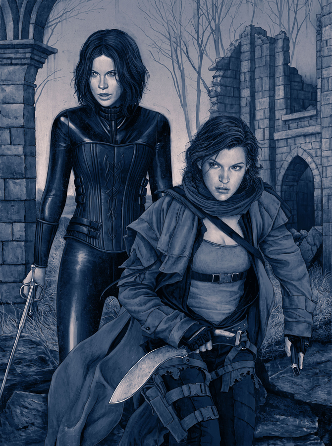Super excited to share this gorgeous full page illustration by RORY KURTZ for Entertainment Weekly’s article on Milla Jovovich and Kate Beckinsale’s respective horror action franchises Underworld & Resident Evil.