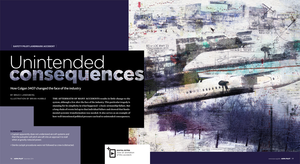 Here’s a great new illustration by BRIAN HUBBLE for AOPA Pilot Magazine. These piece was called “Unintended Consequences.” The article is about how Colgan 3407 changed the face of the industry.