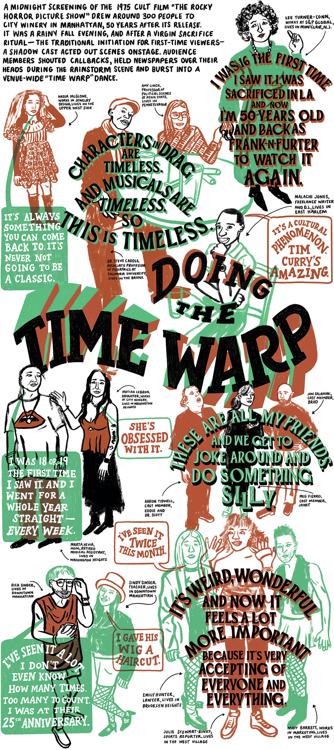 Another Sketch Pad beauty by #lcmartist Vidhya Nagarajan for The New York Times. More drawn journalism, this time featuring the ‘Rocky Horror Picture Show’ at City Winery called “A ‘Weird, Wonderful’ Night at the ‘Rocky Horror Picture Show.’ City Winery’s 50th anniversary screening of the film encouraged some inventive dress up, including tributes to fan favorites like Rocky and Dr. Frank-N-Furter.