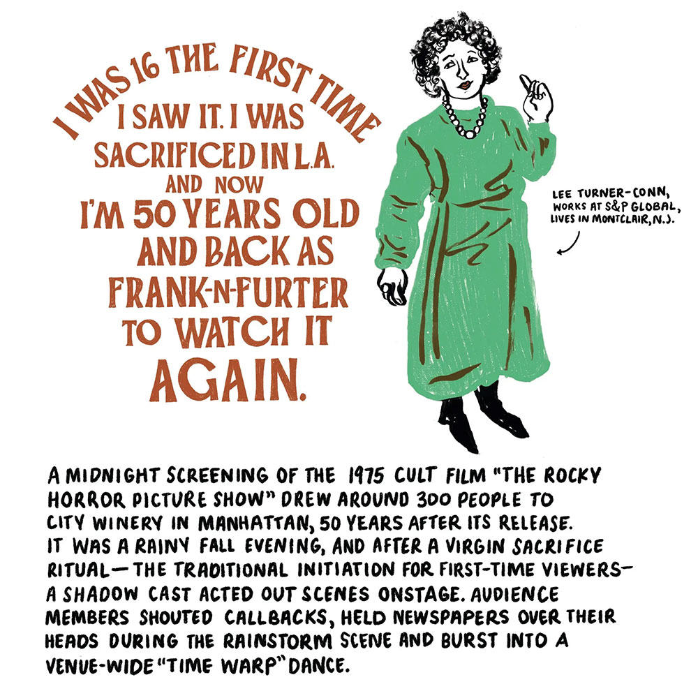 Another Sketch Pad beauty by #lcmartist Vidhya Nagarajan for The New York Times. More drawn journalism, this time featuring the ‘Rocky Horror Picture Show’ at City Winery called “A ‘Weird, Wonderful’ Night at the ‘Rocky Horror Picture Show.’ City Winery’s 50th anniversary screening of the film encouraged some inventive dress up, including tributes to fan favorites like Rocky and Dr. Frank-N-Furter.