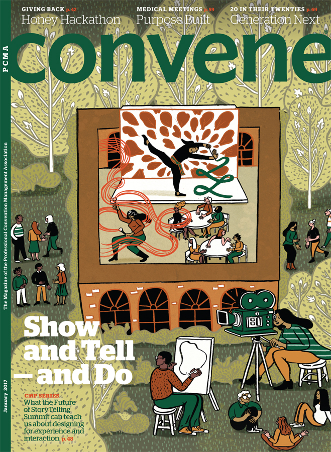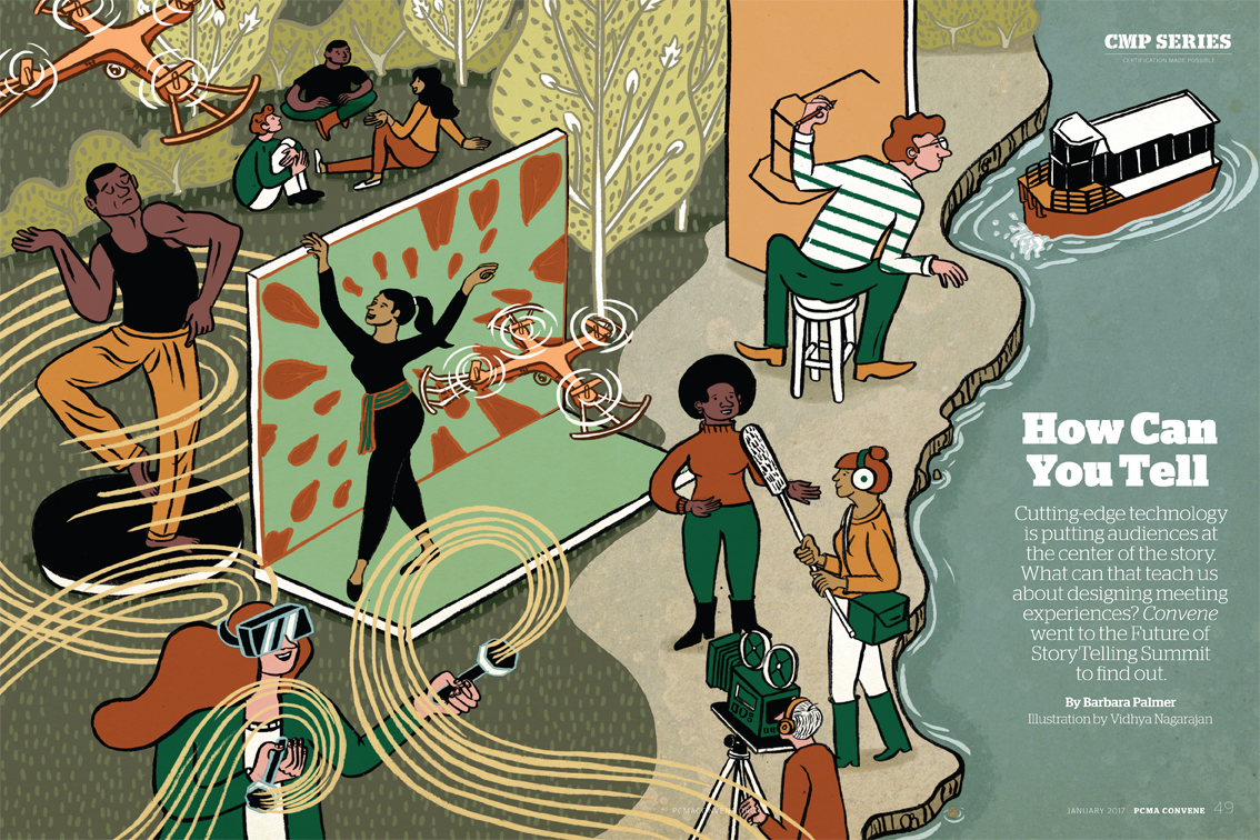 Loving this series by VIDHYA NAGARAJAN for PCMA Convene Magazine. The caption is great, it’s called “Show and Tell and Do” about “CMP Series: What the Future of StoryTelling Summit can teach us about designing for experience and interaction.” PCMA Convene is The Magazine of the Professional Convention Management Association. “How Can You Tell if cutting-edge technology is putting audiences at the center of the story.”